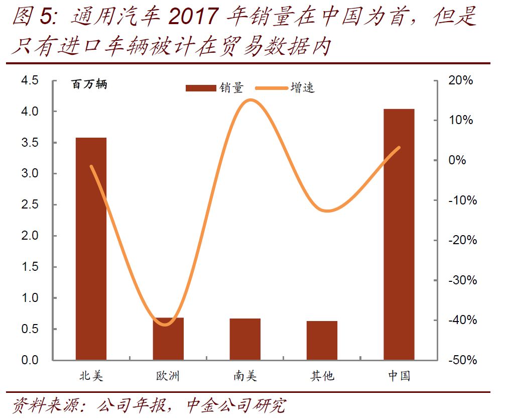 另一方面,中国也是美国少量电子产品的需求方,如苹果手机、特斯拉电动车等。目前大中华区在苹果手机销量中占比到达20%,在特斯拉销量中占比也到达17%,仅次于美国。假如中美贸易争端进一步晋级,不扫除美国局部高科技产品也将遭到影响。如前文所述,虽说苹果奉献的是“中国向美国”的出口,但从301发布的产品清单看,美国巧妙的避过了手机产品,有意将其卷入贸易纷争,但关于中国来讲,像苹果这种在中国有严重利益的企业,无疑也是中国手中的重要筹码,贸易顺差与各国在全球价值链上获取的利益并不是同一概念。(由于中国深度参与全球价值链,除双边直接贸易外,美国少量产品从别国直接向中国出口。依据OECD统计,其他亚洲国度对中国出口金额的3%-4%也应算为美国对华出口。据此预算,美对华出口将添加超越25%,这还没有包括美国在华设立的子公司对中国的销售。从美对华投资看,依据中国商务部的统计,2015年在华美资企业完成销售支出约5170亿美元,利润超越360亿美元。中国市场已成为在华美资企业的重要增长点和利润中心。2016年,通用汽车在华销量387万辆,2017年则是400万辆,是除了南美之外独一完成增长的市场(图5);福特汽车同期在华销量127万辆:两家企业均创历史新高。麦当劳公司在华开设2200多家分店,每分钟销售1600个汉堡。)