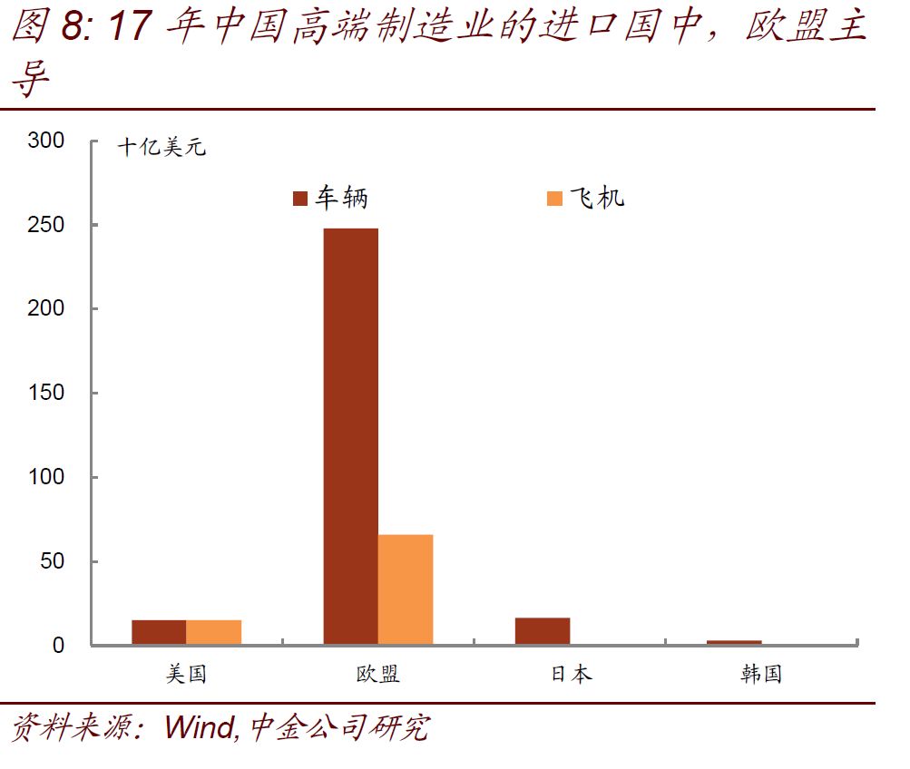中国假如真的出台针对美国的贸易反制措施,美国对中国出口占比拟高的板块如航空产品与部件、农产品、汽车与部件、半导体等将遭到直接冲击。由于在中临时全球贸易具有替代性,中国会添加对其他地域的出口,美国也有能够添加其他地域的出口。最终中国进出口总量遭到的影响无限,受损更多的是美国。以中国的汽车出口来源为例,第一大出口市场是欧盟,第二是日本,其次才是美国(图8)。对美国的贸易制裁可以由欧盟和日本补上,而且由于汽车市场竞争较完全,价钱弹性较大,不会对中国形成额定的担负。飞机范畴由于是垄断市场,假如不能从波音出口,只能转而向空客订购,能够遭到的影响较大。