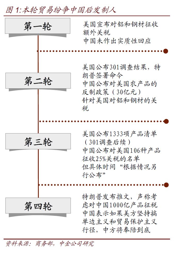 美国外地工夫3月1日(中国3月2日),特朗普在白宫表示,将对出口钢铁和铝辨别征收25%和10%的关税,他表示,钢铁和铝公司不断蒙受不公道的看待,将重新打造美国钢铁和铝产业。但中国未做表示。直到美国宣布(3月22日),将对约600亿美元出口自中国的商品加征关税,对中资投资美国设限并在世贸组织采取针对中国的举动等。(这是根据301调查后果所签署的命令),针对301调查后果,中国的反制措施是:商务部23日发布《关于就美国出口钢铁和铝产品232措施及中方应对措施地下征求意的告诉》,拟对自美出口局部产品加征关税,以均衡美方232措施给中方利益形成的损失。此告诉触及金额仅在30亿元左右,对标的是针对钢铁和铝的关税而非301调查后果,从中可以看出中方的抑制态度,在先发制人的同时只对对方曾经的确落地的政策停止反制。相应的,在美国4月3日发布纳税清单后,(美国贸易代表办公室(USTR)3日发布基于“301调查”后果的中国商品拟纳税清单,发布的拟纳税清单显示,约有1300种商品被列入清单,触及航空航天、机械、医药、通讯、电器等范畴。),中国于4月4日做出反响(依据《中华人民共和国对外贸易法》和《中华人民共和国进出口关税条例》相关规则,经国务院同意,国务院关税税则委员会决议对原产于美国的大豆、汽车、化工品等14类106项商品加征25%的关税。施行日期将视美国政府对我商品加征关税施行状况,由国务院关税税则委员会另行发布),但依然留有先手,“施行日期将视美国政府对我商品加征关税施行状况,由国务院关税税则委员会另行发布”。