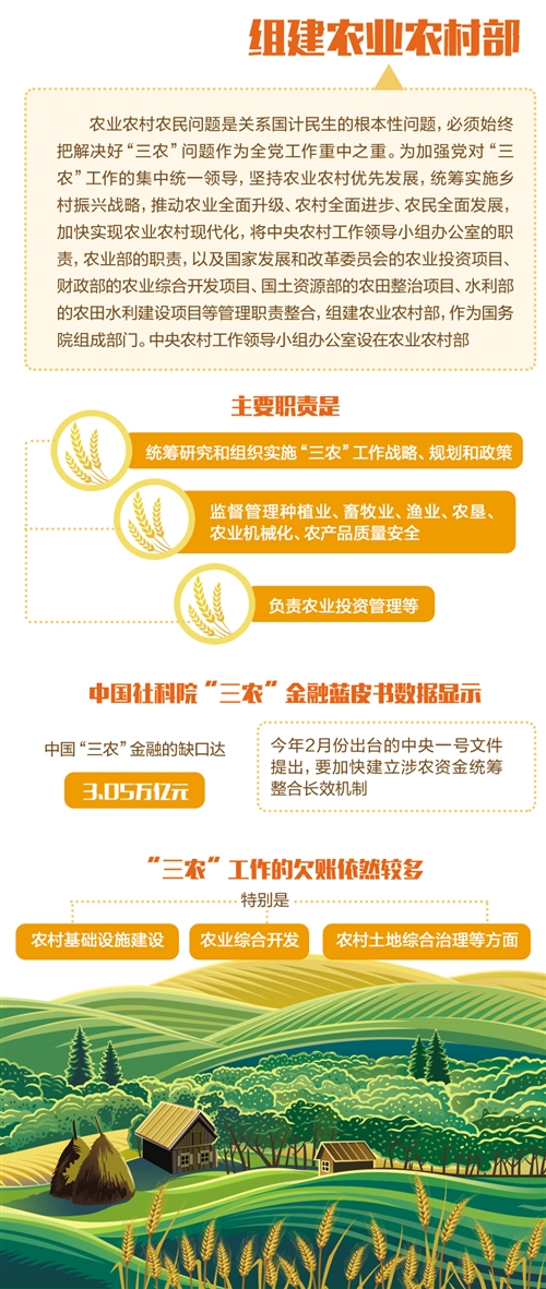 组建农业乡村部也表现了“一类事项准绳上由一个部门统筹、一件事情准绳上由一个部门担任”的机构变革肉体。全国人大农业乡村委员会主任委员陈锡文表示,设立农业乡村部是对乡村复兴战略的详细落实。过来,乡村建立规划管理分散在多个部门,高效推进存在一定难度,农业乡村部有利于补强乡村地域在多个方面的短板,进步施行乡村复兴战略的效率,增强了农业乡村部的“三农”政策和乡村开展职能。