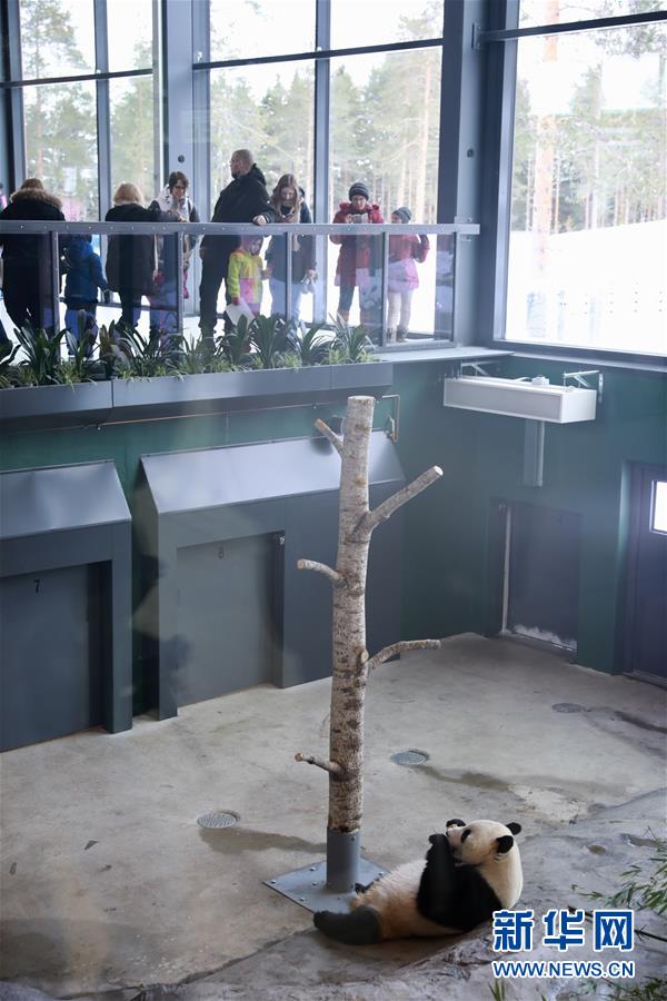 3月2日,在芬兰艾赫泰里植物园,观众在熊猫馆看雄性大熊猫“华豹”。芬兰艾赫泰里植物园的熊猫馆在停止了为期两周的试运营后,将于3月3日举行开馆典礼,届时大熊猫“华豹”和“金宝宝”将与大众正式见面。旅芬大熊猫“华豹”和“金宝宝”往年1月抵达芬兰,已渡过隔离期,逐渐顺应新环境。新华社记者张璇摄