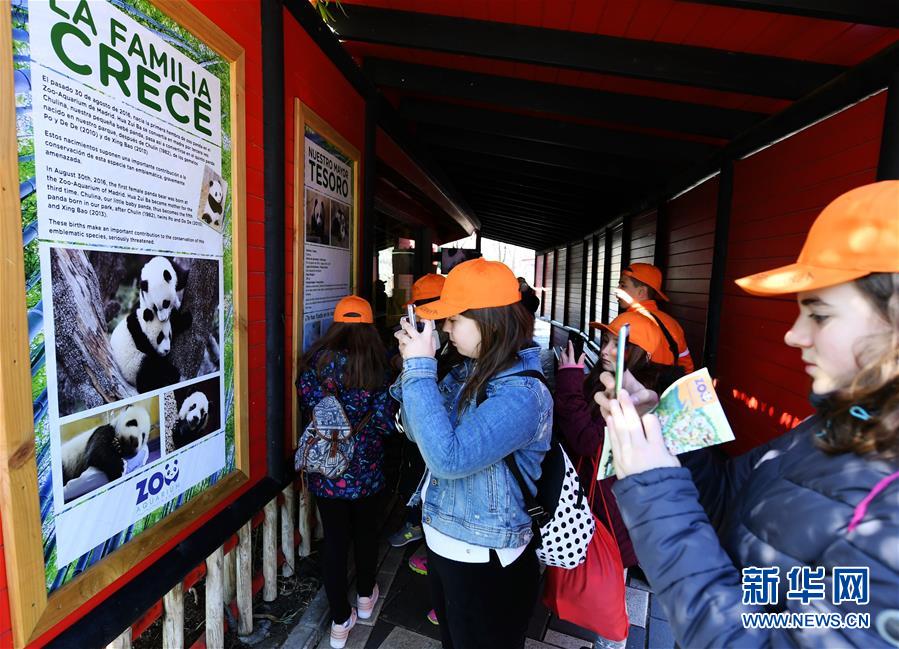 3月22日,在西班牙马德里植物园,几名女孩拍摄大熊猫展板。新华社记者 郭求达 摄