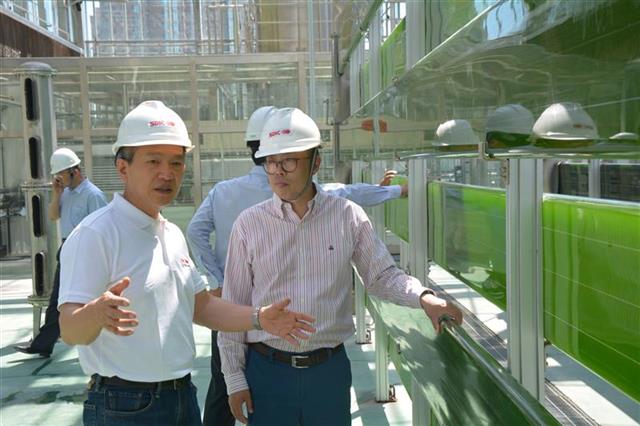 图说1 胡强在微藻生物动力中试消费线(左一) 中科院水生所供图