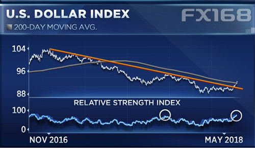 4月27日,美元触及200日挪动均线,并于5月1日打破这一程度。自2017年5月以来,该指数不断没有高于这一关键程度。